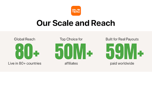 Think of the TEMU Affiliate Program as your gateway to global earnings. Live in over 80 countries, TEMU allows affiliates to connect with millions of shoppers worldwide. No matter if you operate a coupon site, a loyalty program, a payment solution, or simply have traffic to monetize, there’s a place for you here.